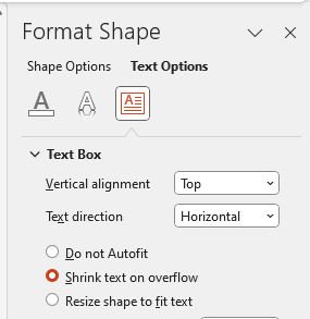 If you’re getting frustrated because PowerPoint keeps resizing your text, but you’d like to keep a consistent size, just Format Shape and choose ‘Do not Autofit’: